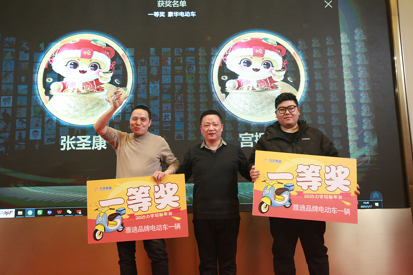 年会上半部份主要是精彩的节目表演和激动人心的抽奖环节。抽奖活动分三轮举行,抽奖级别分为三等奖,二等奖,一等奖。整体中奖率高达30%,晚会期间,生产和销售的小伙伴们,纷纷登台亮相,一展自己的风采;节目过程中穿插的员工互动游戏热闹非凡;三项抽奖活动42个奖项将年会现场氛围推向了高潮,终极大奖2辆品牌电动车最终花落张圣康、宫振洁手中。新年晚宴上全体员工为新的一年举杯同庆,共同祝愿聚能的明天会更好。